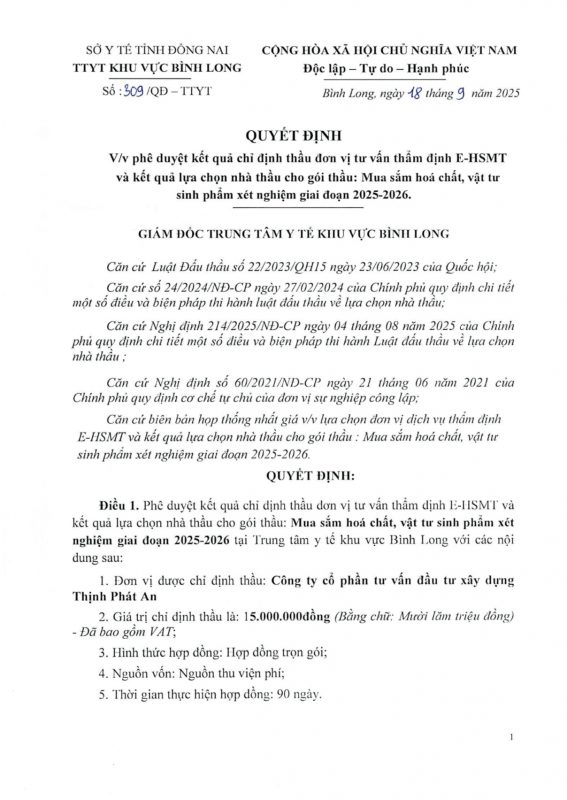 Trung tâm Y tế khu vực Bình Long trân trọng thông báo kết quả chỉ định thầu đối với Gói thầu “Mua sắm hóa chất, vật tư sinh phẩm xét nghiệm giai đoạn 2025–2026”, cụ thể: