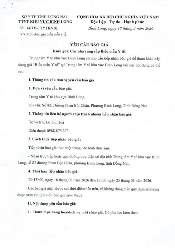 Trung tâm Y tế khu vực Bình Long có nhu cầu tiếp nhận báo giá để tham khảo xây dựng giá đối với danh mục “Biểu mẫu Y tế” tại đơn vị. Kính mời các đơn vị, đối tác quan tâm gửi báo giá về Trung tâm.
